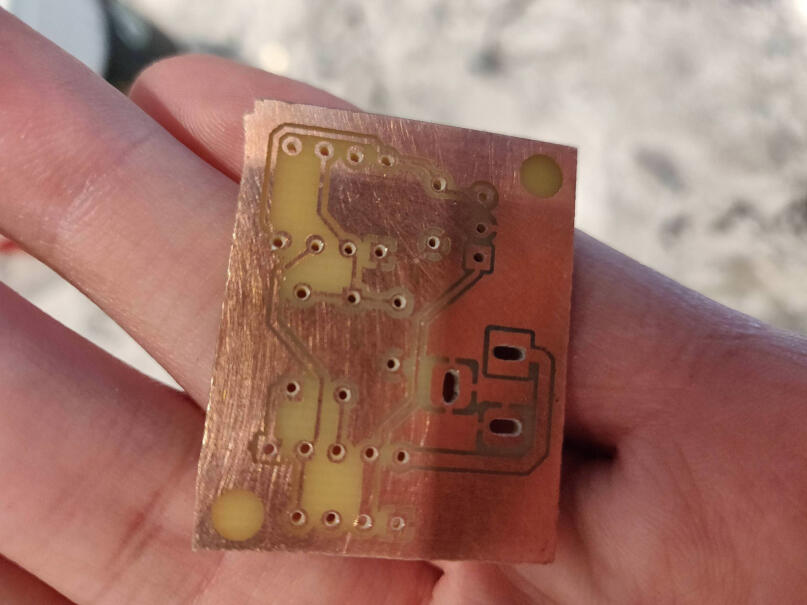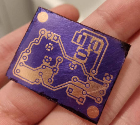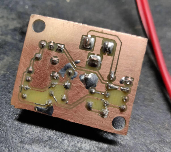 Soldered and fixed short on bottom right with a box cutter. May experiment with UV curing mask, but it seems not worth the effort.