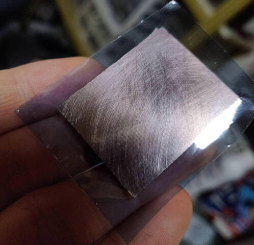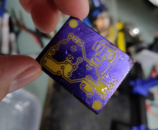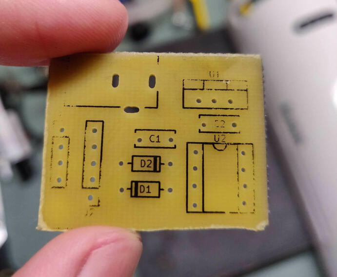 I'm going to use a UV sensitive film lamination process to save money. After frustratingly picking at the edges and a satisfying peel, you laminate this film on to the bare copper board. I put a piece of paper in between the board and the laminator, to protect the plastic.