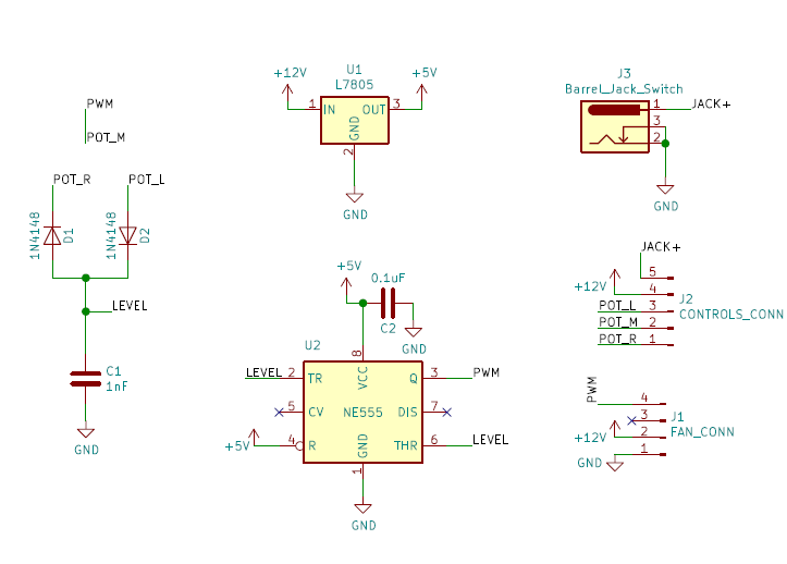 Decided to pick up KiCAD for this project. Using PWM 555 timer circuits I found online, and some capacitor and diode calculations, I figured out what values would get me in the ballpark of 25Khz which is the PWM frequency for 4 pin PC fans.