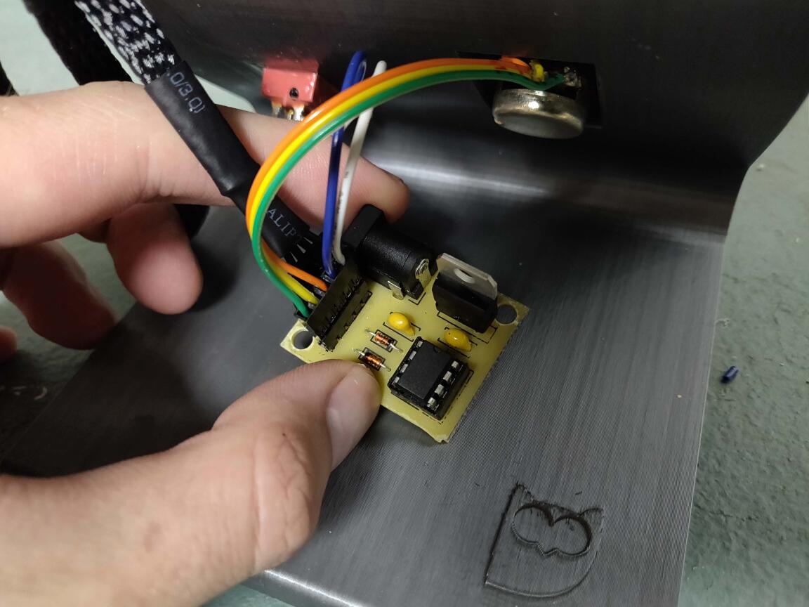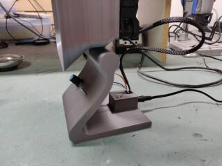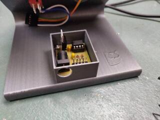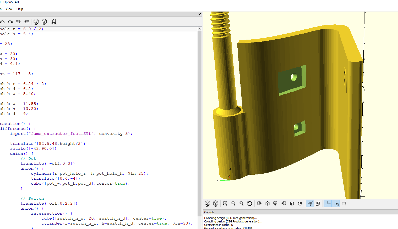 First I found a model for a fume extractor, and modified the base to accept a switch and potentiometer using OpenSCAD (Model from) https://www.thingiverse.com/thing:1436781
