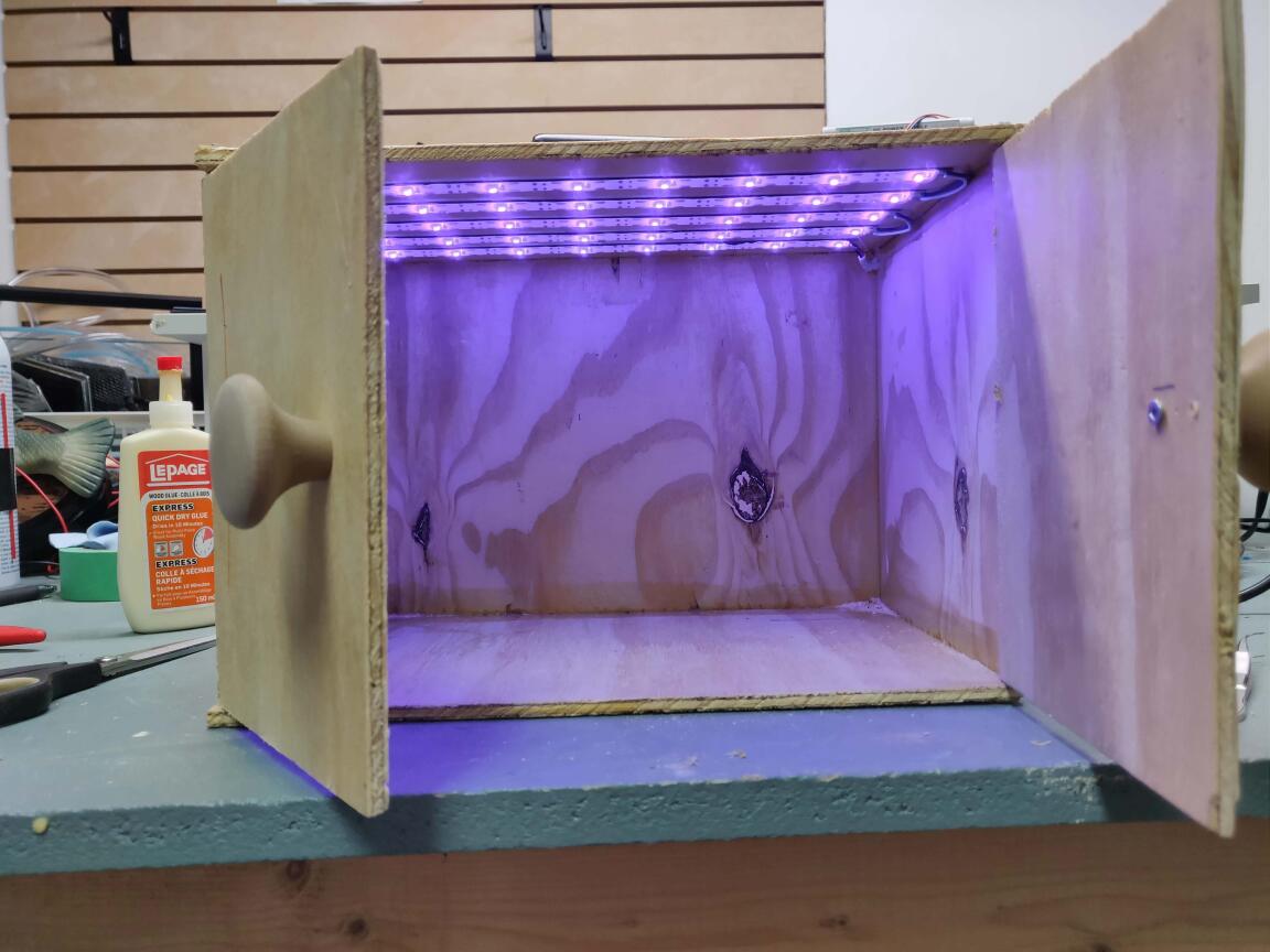 I built this UV curing box using a UV led strip from amazon and some wood PLA 3d printed knobs. It's pure garbage construction, but does the job. Just plugs in to a USB power bank with a cord on the top.