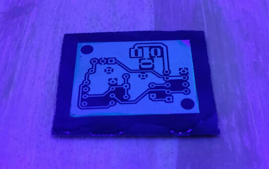 Exposing the board with some mineral oil between a laser printed transparency sheet (1 layer) to help it stay put but not stick. UV LEDs take about 15 minutes to get a good exposure.